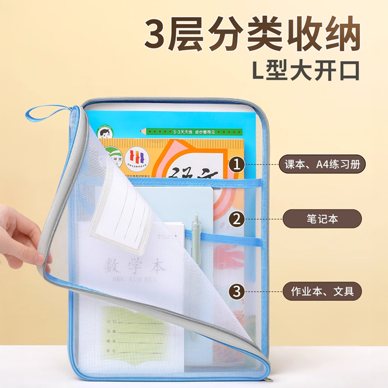 学科科目分类文件袋小学生拉链式用大容量书本分科书袋试卷收纳袋学生装资料袋子作业A4透明网纱手提书包开学