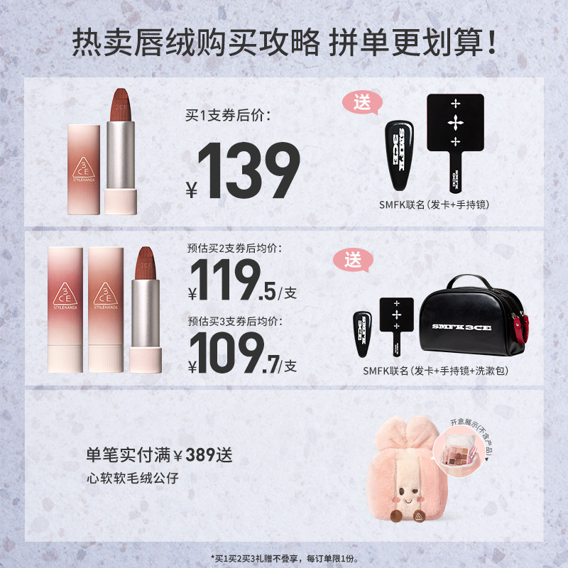 【狂欢再续】3CE唇绒口红唇膏唇釉秋冬滋润哑光显白裸色围炉棕
