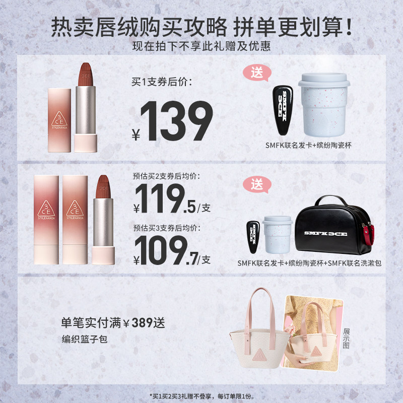 【38大促】3CE唇绒口红唇膏唇釉秋冬滋润哑光显白裸色围炉棕