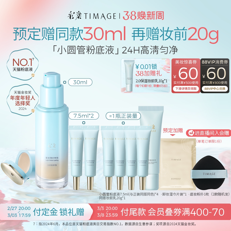 【抢先付定】彩棠TIMAGE小圆管粉底液遮瑕持久不脱妆滋润保湿