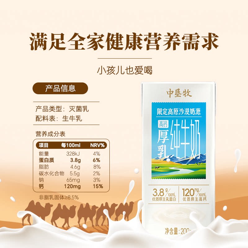 【蜜蜂惊喜社】中垦牧3.8特浓纯牛奶高原沙漠200g x10盒整箱
