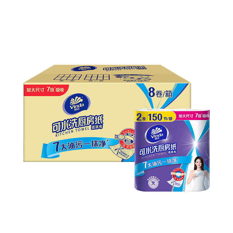 维达厨房卷纸食品级可水洗2层75节8卷加大尺寸吸水去油污不易破