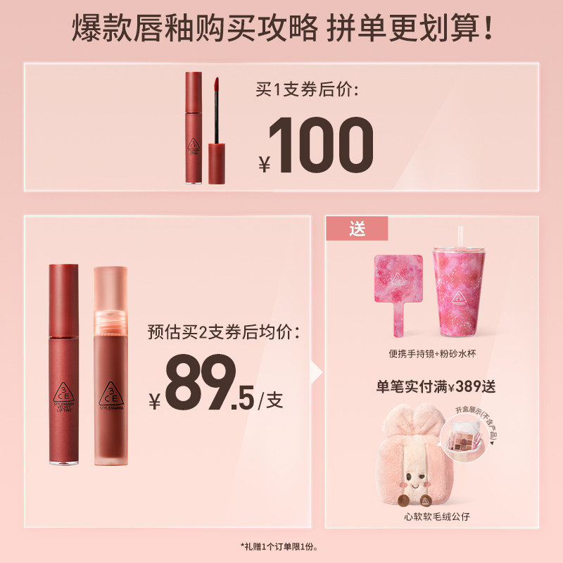 【38礼遇季】3CE水雾唇露唇釉口红持久不易沾杯laydown乌龙奶茶