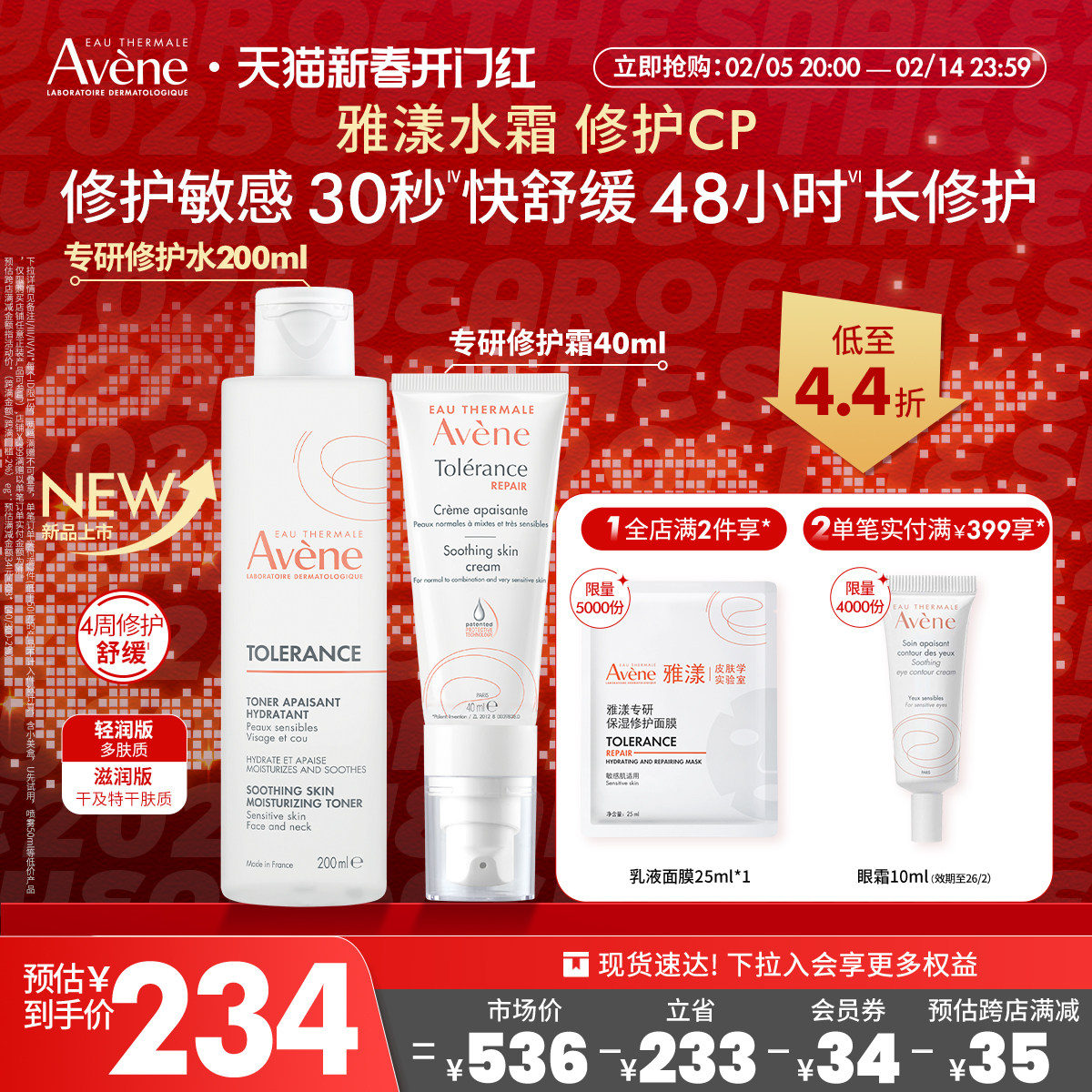【倒计时1天】雅漾专研修护霜舒缓泛红面霜敏感肌保湿滋润avene