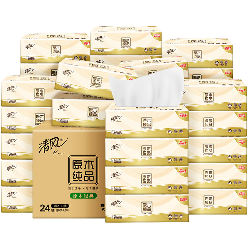 【下拉详情享优惠】清风抽纸原木纯品3层100抽24包面巾纸餐巾纸