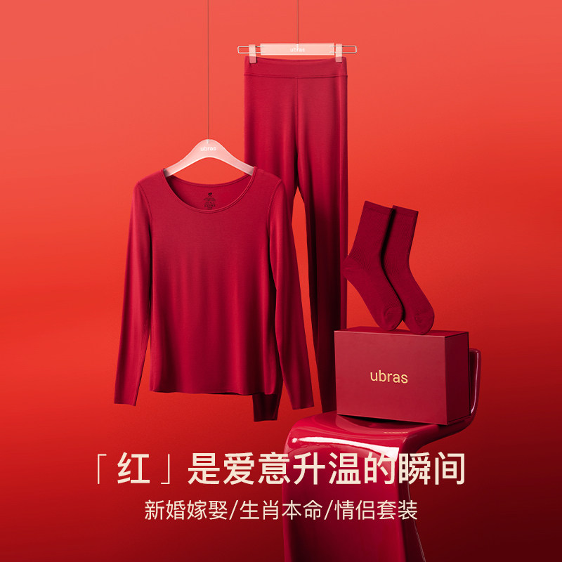 ubras本命年红色加绒加厚羊毛保暖内衣女套装新年开运秋裤秋衣男