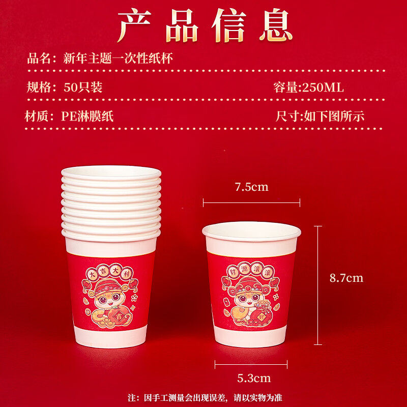 优奥蛇年纸杯一次性杯子加厚家商用金蛇送财装红色新年250ml*50只