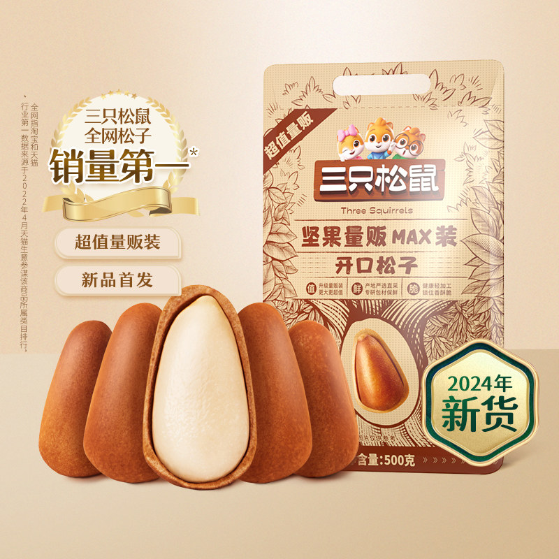 【三只松鼠量贩东北松子500g】2024新货开口虎皮松子罐装坚果零食