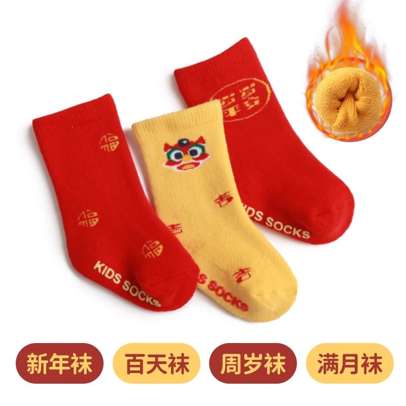 春秋婴儿纯棉满月百天周岁新年抓周红色男女童中筒袜子秋冬季婴童