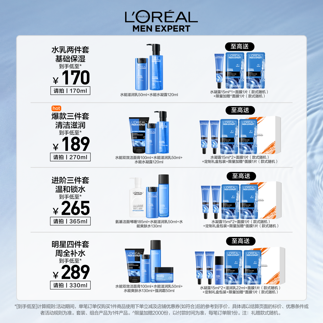 欧莱雅男士补水保湿套装洗面奶水乳面霜护肤品清爽男生生日礼物