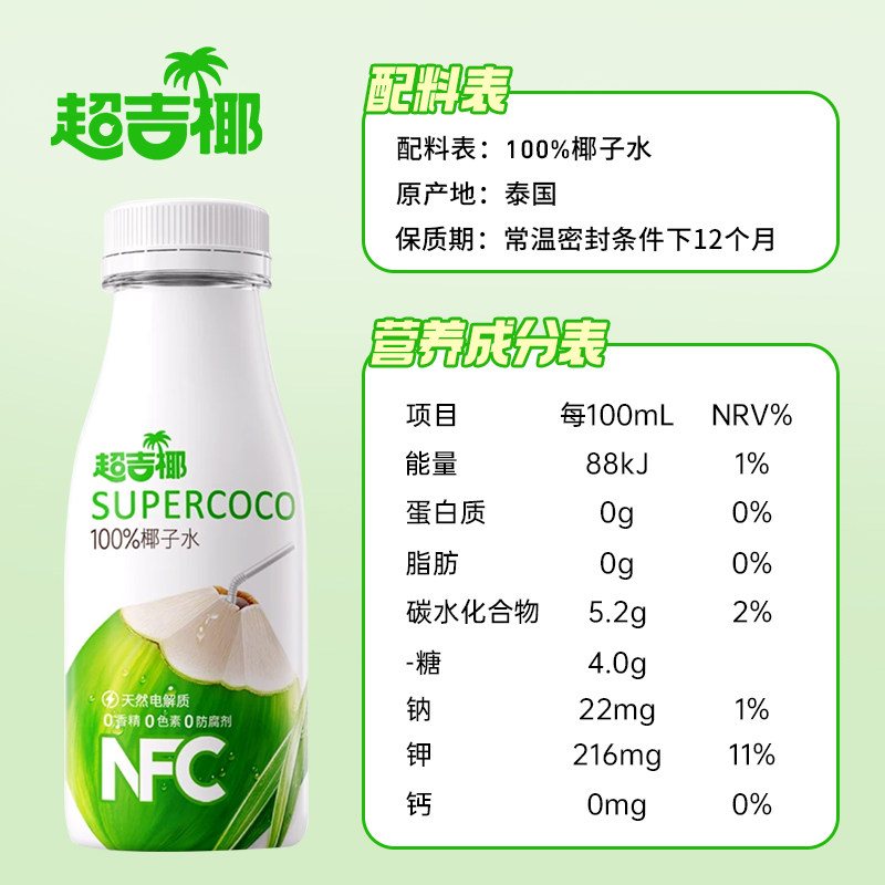 超吉椰100%纯椰子水NFC果汁椰子汁椰汁饮品小瓶饮料整箱245ml*10