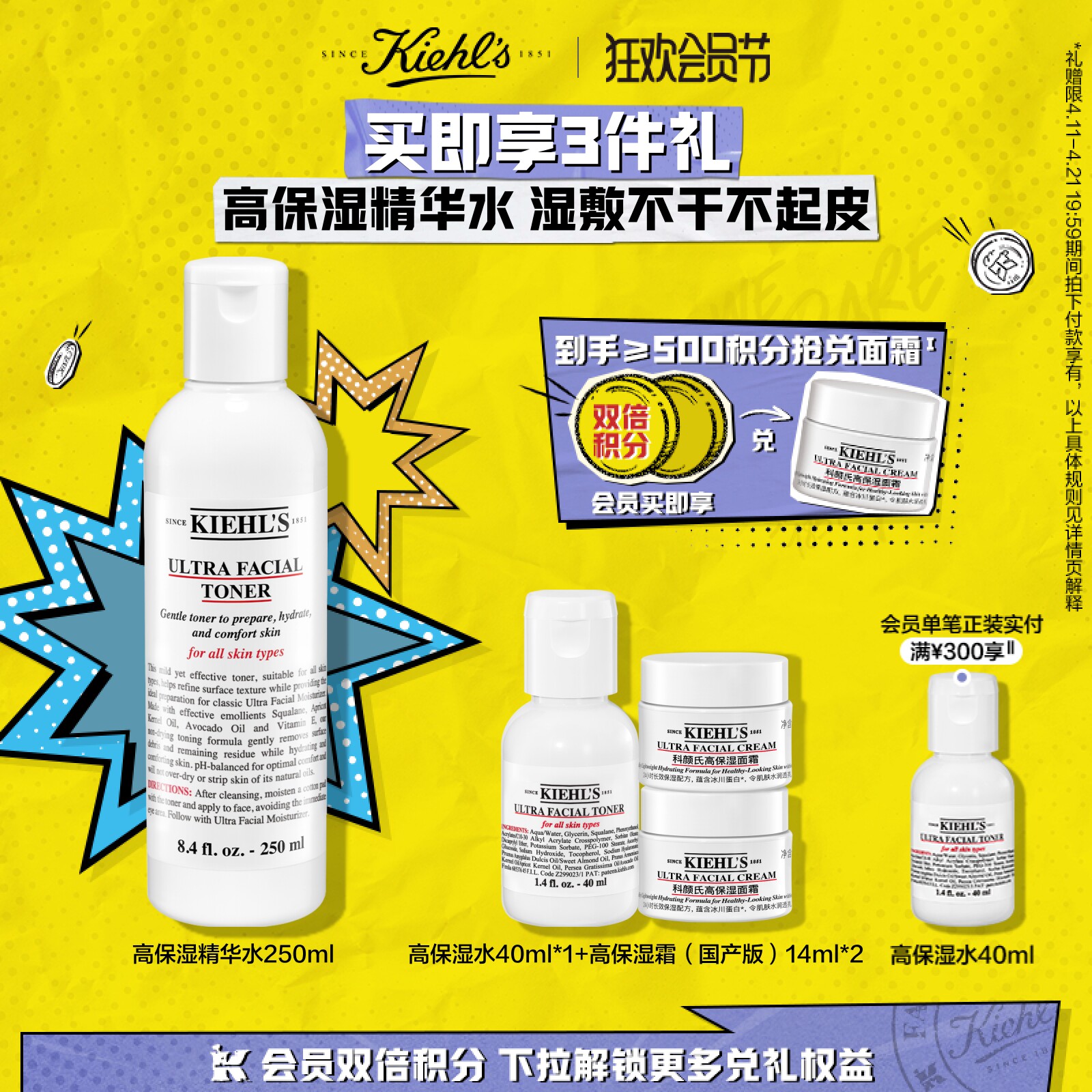 【会员双倍积分】科颜氏高保湿精华水爽肤水补水保湿滋润湿敷水乳