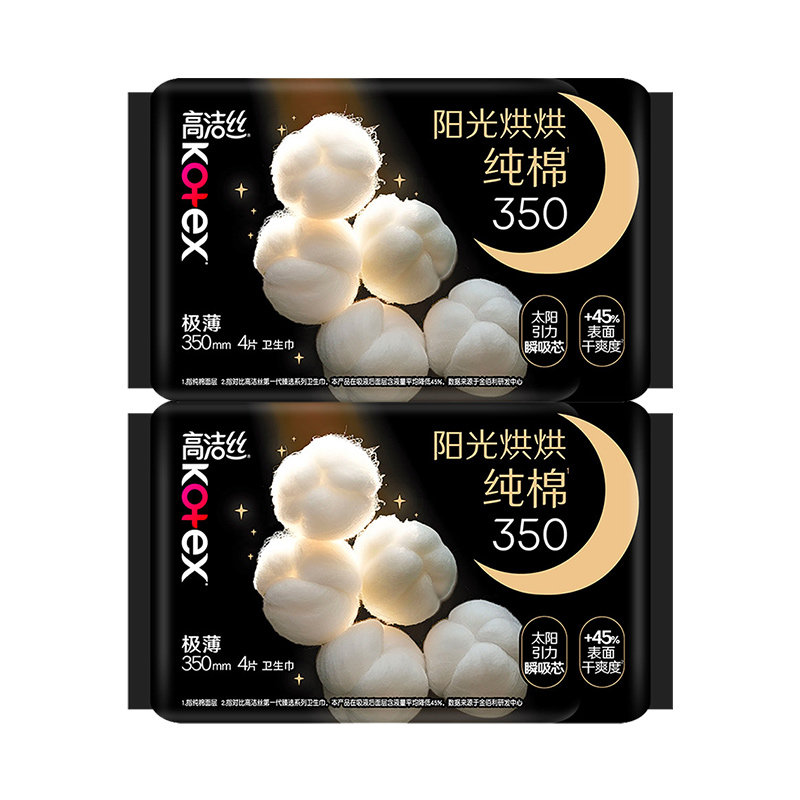 高洁丝阳光奢爽夜用纯棉卫生巾姨妈巾350mm8超长亲肤【官方正品】