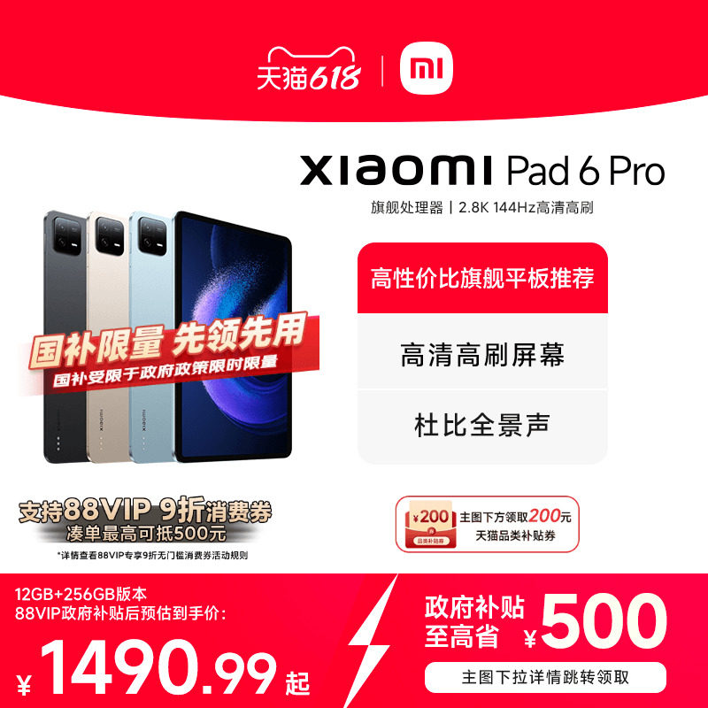 【88VIP 9折+政府补贴15%】小米平板6Pro平板电脑办公2.8K144HZ高清平板